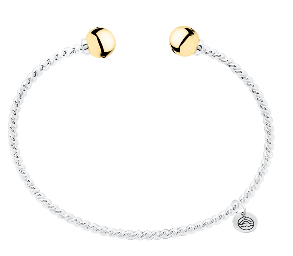 The high polish balls make the texture of the twisted wire pop. Looks great layered with the Single Ball bracelet. Available in all sterling silver, or sterling silver with a yellow accent.
